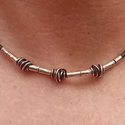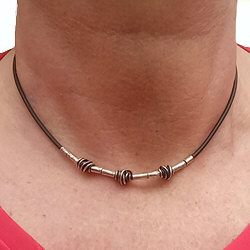 Dit rubbersnoer met handgemaakte zilveren bedels van Flamenco staat mooi als het direct om de hals gedragen wordt. De dikte van het rubbersnoer is 2 mm. De grootste bedels zijn geoxideerd (gezwart). Het rubbersnoer heeft een veerring als sluiting.